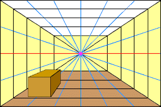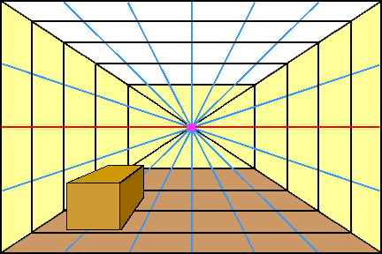 The Horizon Line is the place where the ground and the sky seem to meet (red line). In one-point perspective the Vanishing Point, represented as a magenta dot in this picture, is always on the Horizon Line. As things get closer to the Vanishing Point they get smaller and smaller until they appear to vanish .